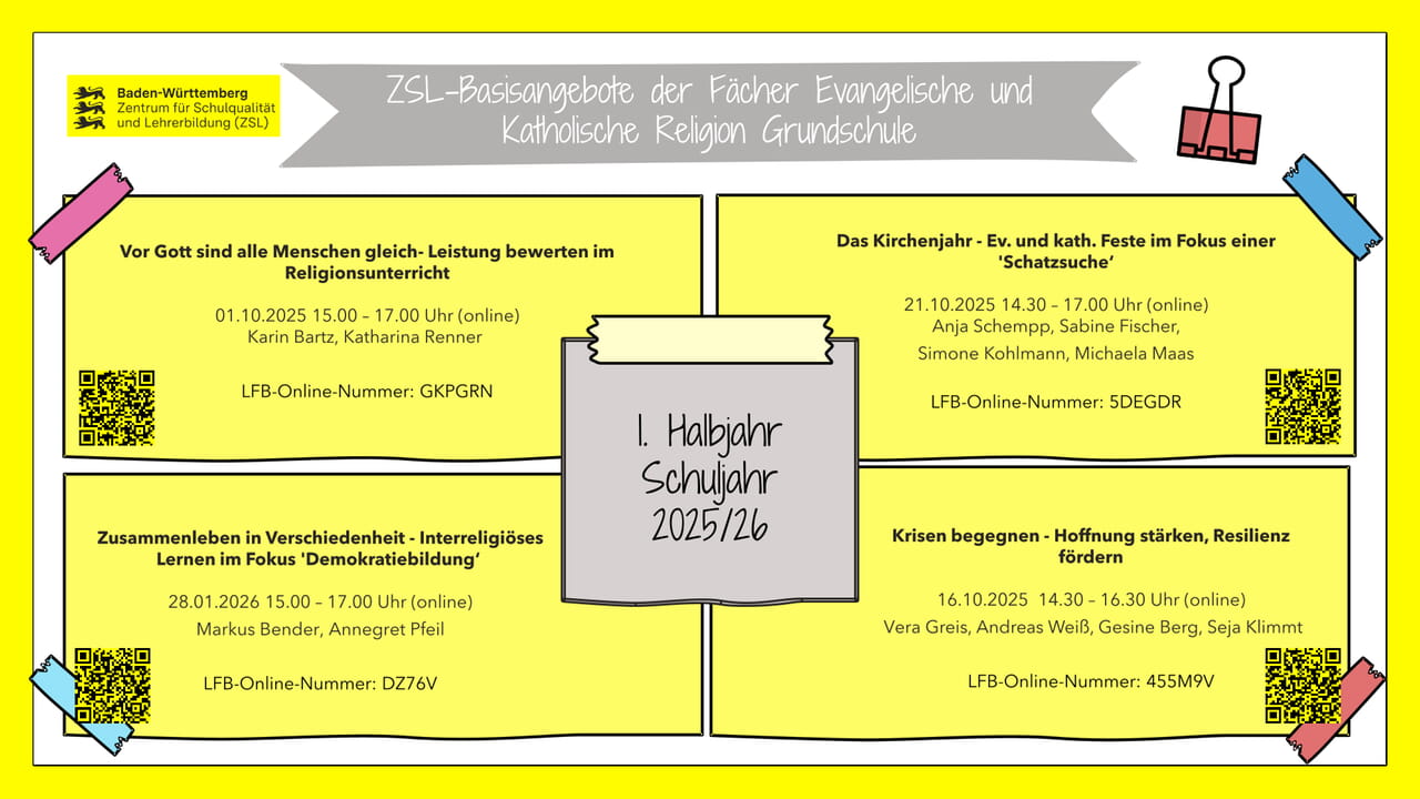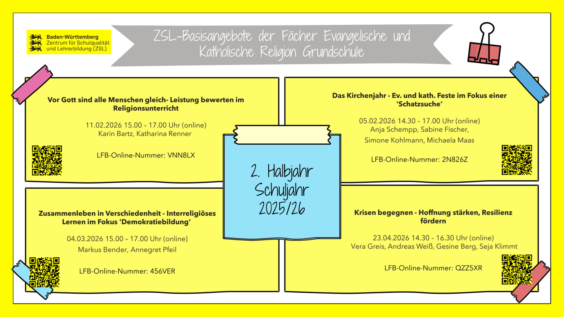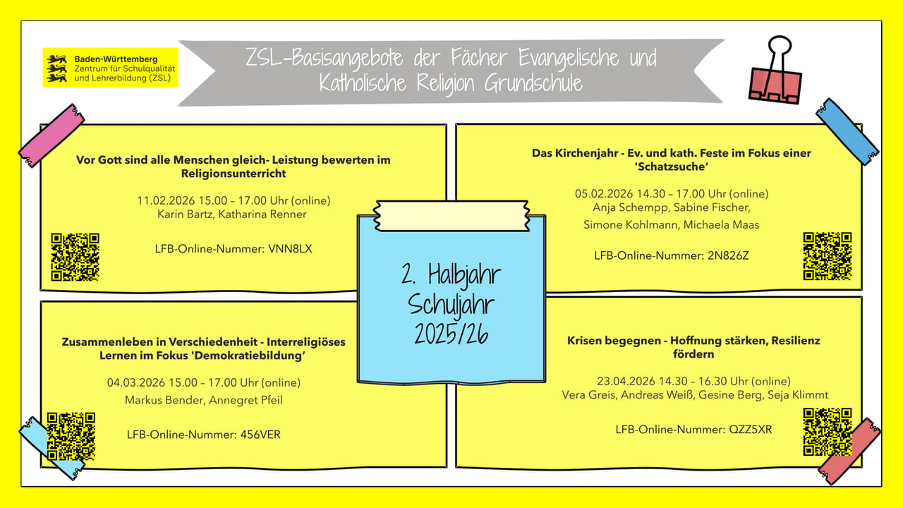 Das Zentrum für Schulqualität und Lehrerbildung (ZSL) bietet landesweite Online-Fortbildungen zu grundlegenden Themen des Religionsunterrichts in der Grundschule an. Die Fortbildungen werden von Fachberaterinnen und Fachberatern Unterrichtsentwicklung beider Konfessionen verantwortet. Alle Interessierten sind herzlich dazu eingeladen!